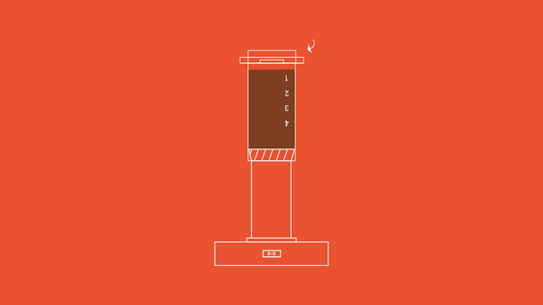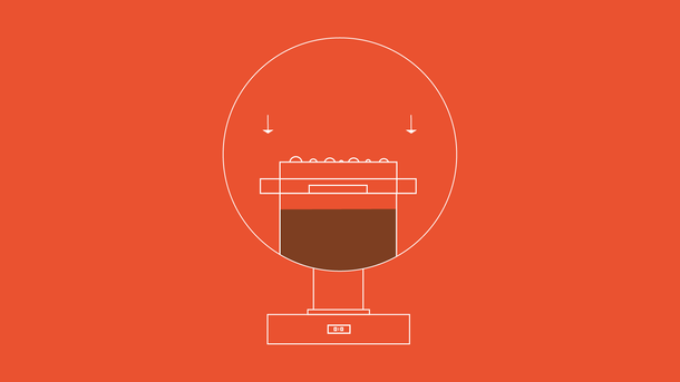 At 40 seconds remove Aeropress from scales and push out air by holding onto sides. Keep pushing until there are no more bubbles on the cap surface.