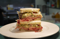 Bloomer-sliced white bread with ham, brie, cranberry relish, caramelised onion stuffing, topped with a brussel slaw in a honey mustard dressing.