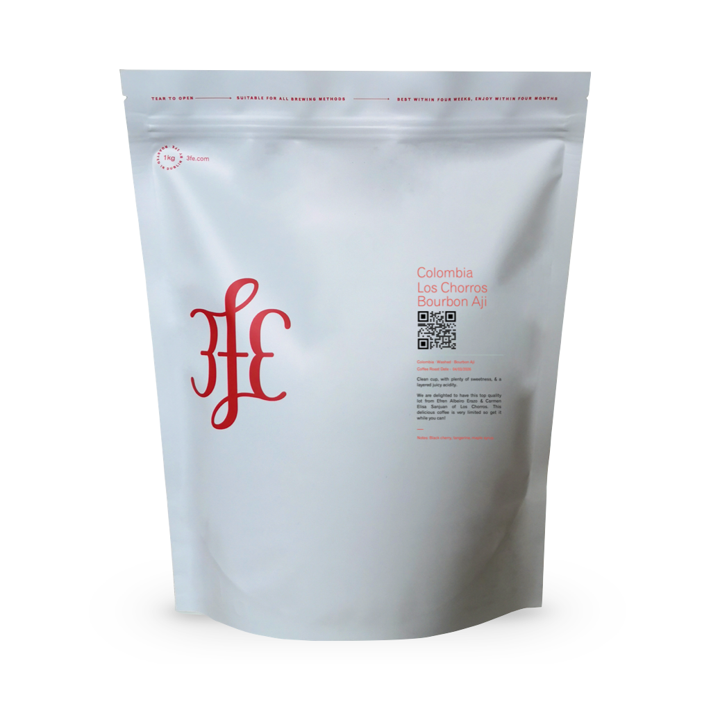 Los Chorros Bourbon Aji has been packaged in our Colombian Artist Origin Project bag. The Artist Origin Project is a collaborative initiative where artists from coffee producing countries are invited to create bespoke artwork for 3fe. This origin bag has been designed by Colombian artist, Dario Trivińo. For more on Los Chorros, be sure to check out our blog.