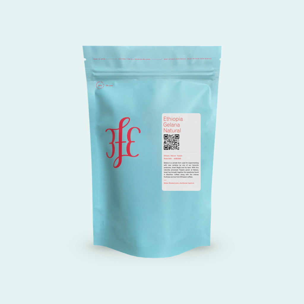 Gelana is a private farm used for experimenting with new varieties by one of our favourite producers, Israel Degfa and his team. With this naturally processed Topazio grown at Gelana, Israel has brought together the sweetness found in Brazillian coffees along with the intense fruitiness we love from Ethiopian coffees.